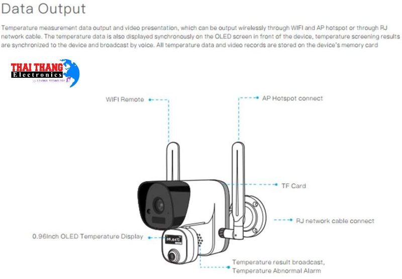 Tất cả các kết quả đo, dữ liệu hình ảnh nhiệt độ và video ghi được sẽ được lưu vào thẻ nhớ gắn trên thiết bị  Khi phát hiện thân nhiệt cao bất thường.thiết bị sẽ kích hoạt cảnh báo và cảnh báo bằng giọng nói tích hợp và trên thiết bị đã kết nối.