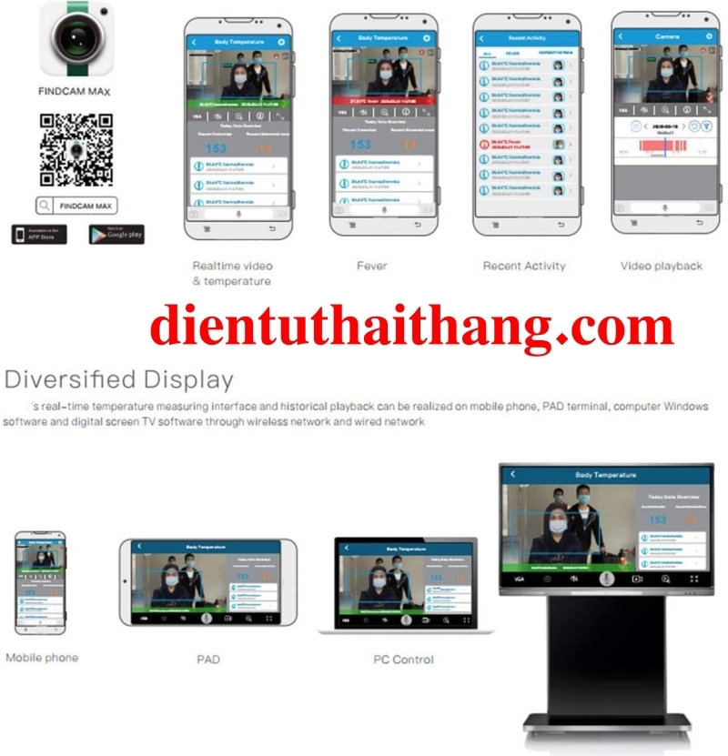 Có thể kết nối màn hình kỹ thuật số, điện thoại, máy tính bảng, laptop ,với smart TV , kết nối trực tiếp camera  thông qua WIFI, cáp và mạng (LAN). khi kết nối với các thiết bị ngừoi sử dụng có thể xem video trực tiếp từ xa theo dõi đo nhiệt độ, dữ liệu thống kê sẽ được hiển thị theo thời gian thực trên thiết bị cuar người sử dụng , kiểm tra lại lịch sử của từng người , từng lần đo cụ thể , ghi hình ảnh và phát lại video. Giúp bạn quan sát từ xa 1 cách hiệu quả nhất